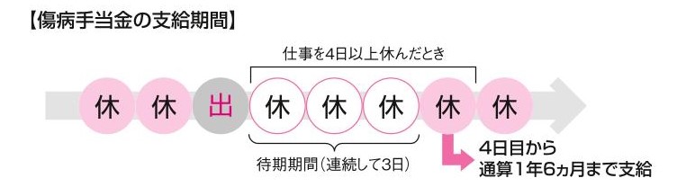 | 条件 | 病気・けがで仕事につけず、下記の4条件に該当する被保険者 ①業務外の病気・けがで療養中 ②いままでの仕事につけない ③連続して3日以上休んでいる ④給料等をもらえない |
