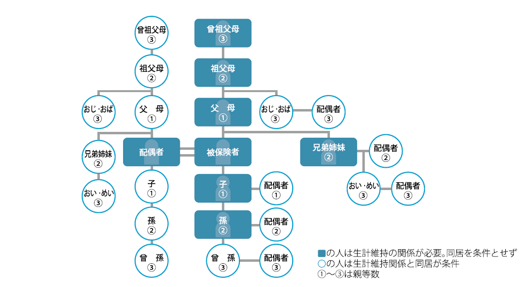 被扶養者になれるのは被保険者から見て三親等内の親族に含まれている人に限られます。 三親等内の親族図