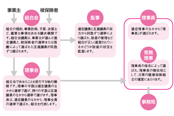 健保組合の組織は、運営を民主的かつ円滑に行うため、組合会、理事会が設けられ、被保険者は選挙を通じて、健保組合の事業運営に直接参加することができます。