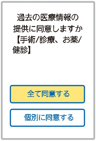 過去に受けた特定健診の結果や処方された薬の情報などの医療情報について、医師・薬剤師に情報提供することに同意するかを選択します。個別に同意することもできます。