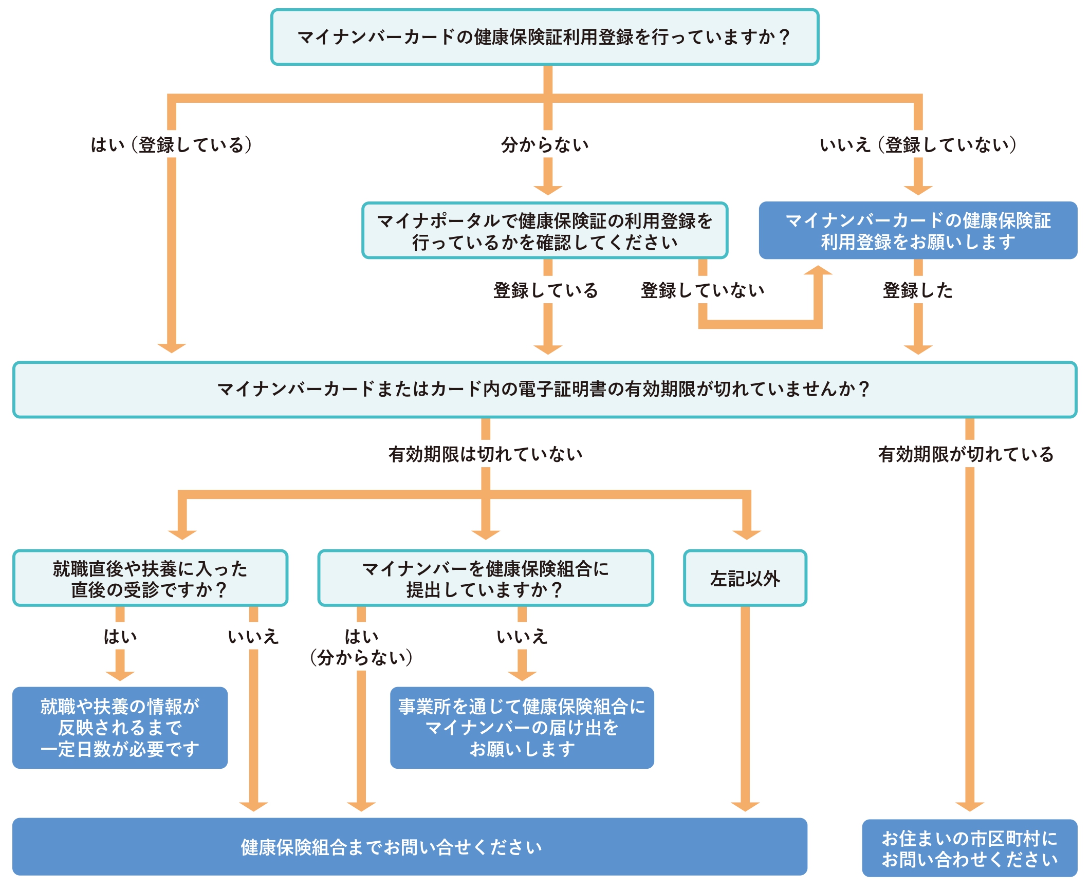 医療機関等でマイナ保険証が使用できなかった場合は、医療機関側の機器のトラブル以外にいくつかの原因が考えられますので、以下のチャートをご確認いただき、ご対応ください。