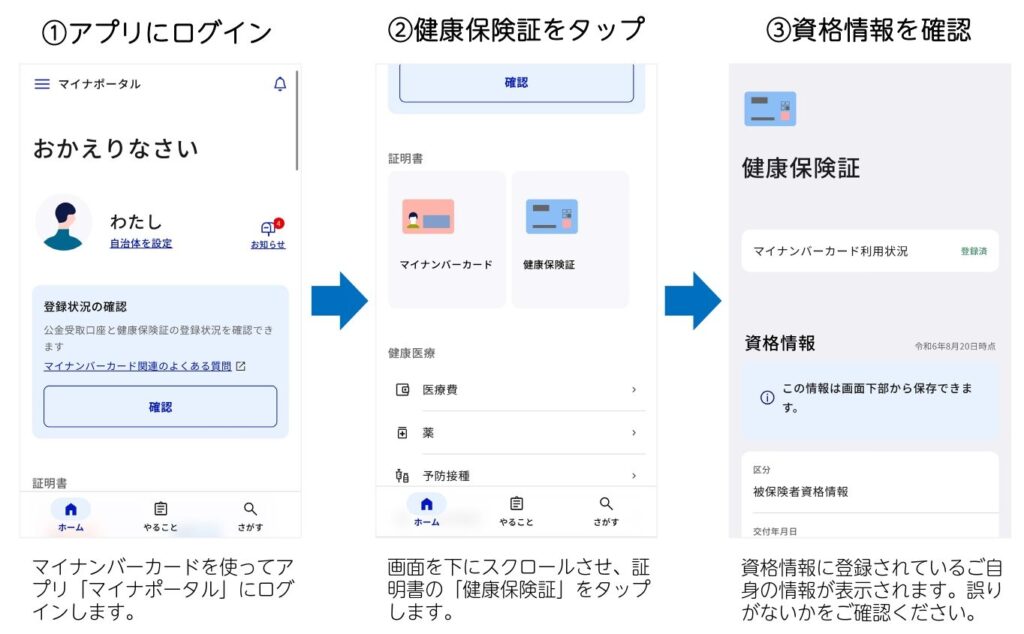 スマートフォンでマイナポータルアプリを使用してマイナポータルにログインし、最新の資格情報をご確認ください。